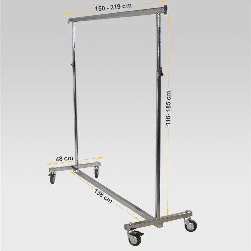 Kleiderständer mit 2 seitlichen Auszügen, ca. 100 Kg Traglast, Metallrollen mit Kunststoffbeschichtung, höhenverstellbar 116 - 185 cm, breitenverstellbar 150 + 2 x 33 cm & 100 + 2 x 33 cm, Tiefe 50 cm. 1 Stück.